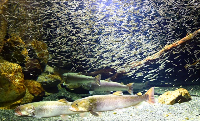 Many glass tanks line the dark corridors. Be sure to see all of the rare Hokkaido aquatic life, southern fish, northern fish and a panoramic view of the sea in the wall aquariums.